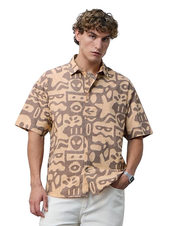 The Souled Store Oversized Shirt: Marine Men and Boys Short Sleeves Collared Neck Button Front Brown All Over Printed Cotton Oversized Shirts